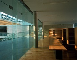 Das zweiseitig verglaste zentrale Bindeglied der beiden Schulen ist einerseits Pausenhalle und beherbergt die Bibliothek; andererseits vermittelt es den Einstieg in zwei Gangsysteme, die die nach Norden orientierten Bereiche für Sonderunterricht und Verwaltung erschließen. Die Blickachsen sind in den Gängen offen, sodaß sich die Erschließungswege optisch im Freien fortsetzen.