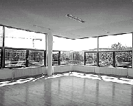 Selbst für Kinder ist der Blick über das - nur 60 Zentimeter hohe - Parapett gut möglich. Die Außenwände sind darüber gänzlich verglast, zu einem großen Teil mit feststehenden Scheiben, die von schmalen Profilen gehalten werden. Die Belüftung ist durch einige wenige Flügel sichergestellt, die Behaglichkeit im Sommer durch einen außenliegenden Sonnenschutz.