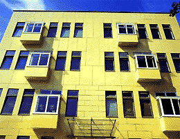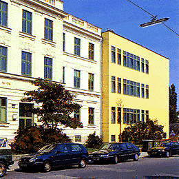 Die Straßenseite enthält klassische Elemente wie Sockel, Bel Etage und Attika. Die Schmalseite des Baus hat 6 asymetrisch versetzte Loggien, die sich in den Klassenzimmern befinden und die ein ungewohntes Angebot an die Schüler darstellt. Die Gartenseite präsentiert sich in einer schlicht verputzten Fassade in weiß mit grünen Fensterrahmen. Großflächige Verglasungen im Pausen- und Bibliotheksbereich.