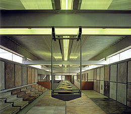 Im Erdgeschoss der Halle befinden sich die Beratungstische, Verkaufspult und Kasse. Symmetrisch dazu führen auf beiden Seiten Treppen zu den Galerien hinauf und abwärts zu den Musterräumen.