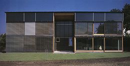 Diese Kartonwaben sind mit Gußdrahtglas überdeckt. In ihnen wird die warme Luft gespeichert und wirkt so als Isolierung. Der Rest der Südseite ist vollverglast, die übrigen Seiten des Hauses weisen Minimalöffnungen auf. Für das Warmwasser wurden Solarpaneele angelegt.