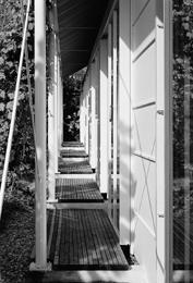 Die Holzteile des Wohnteils wurden abgelängt geliefert und an einem Tag mit vier Mann in Eigenleistung montiert. Unkonventionelle Mischung aus tradiertem Satteldachtypus mit klassisch perspektivischer Zimmer-Enfilade, in modernen Einheits-Raum verwandelbar. Jeder Raumteil hat direkten Ausgang zum Garten. Zufahrt: Hofer Straße, Ruggburgstraße, Am Reutelebach, Sonnenhalde. (Text: Otto Kapfinger in „Baukunst in Vorarlberg seit 1980, Hrsg. VAI / KUB“)