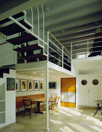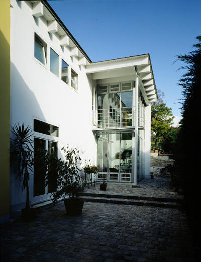 Wie gesagt, generell hat Luigi Blau die Konfrontation mit dem Altbau nicht bewußt sucht, er hat sie keinesfalls überstrapaziert. Daher ist der Neubau in einer vergleichsweise konventionellen Technologie errichtet, in hochwärmedämmendem, 38 Zentimeter starkem Ziegelmauerwerk. Die weiß gestrichenen Holzbalkendecken drinnen treten im Obergeschoß auch außen sichtbar in Erscheinung. Die Wände sind weiß, auf dem Boden liegen im Erdgeschoß bruchrauhe Sollnhofer Platten, im Obergeschoß gebeizte Eichenparkette. Das heißt: Der Materialaufwand und die damit erzielten Effekte bewegen sich durchwegs in den Grenzen gepflegter Wohnlichkeit. Nichts Überzogenes fällt auf, die architektonischen und gestalterischen Maßnahmen sind nicht Selbstzweck, sondern bilden den räumlichen Hintergrund für etwas, was sich jenseits von Architektur und Design ereignen muß, was von den Bewohnern selbst kommen muß.