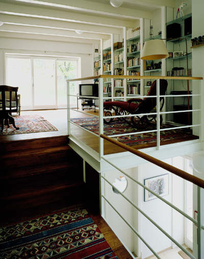 Der Wohnraum ist teilweise zweigeschoßig, wunderbar tagesbelichtet und durch den Verlauf der Treppe mit eingeschobenem Zwischenpodest und das teilweise galerieartige Obergeschoß in unterschiedlich hohe Bereiche differenziert. Das führt dazu, daß zum Beispiel der Eßplatz - unter dem Zwischenpodest gelegen - mit einer relativ niedrigen Raumhöhe auskommt, während man im Bereich der zweigeschoßigen Verglasung die volle, die doppelte Raumhöhe hat. Funktionell ist natürlich alles bedacht: im Erd- geschoß etwa die Verbindung zur Küche, auch im Obergeschoß, wo sich ein Gartenzimmer über eine große Terrassentüre direkt ins Freie, auf den hinter dem Haus liegenden Hang öffnet.