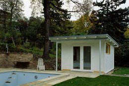 Luigi Blau hat besonders darauf geachtet, daß die Anbindung des Neubaus an den Altbau niveaugleich erfolgt. Das Elternschlafzimmer, im Obergeschoß Richtung Altbau gelegen, befindet sich also auf der gleichen Ebene wie die Kinderzimmer. Andererseits macht die Komposition des Zubaus auf den Hang gewisse Terrainsprünge im Haus unvermeidlich: Das ist allerdings reizvoll und teilt sich als Qualität mit. Genauso wie auch die unterschiedlichen Raumhöhen eine Qualität darstellen, denn sie sorgen für differenzierte atmosphärische Bereiche im Haus, für Intimität, aber auch für Großzügigkeit. Übrigens war es notwendig, das Gelände im unmittelbaren Vorfeld des Hauses, da, wo man von der Straße eintritt, ein wenig abzugraben, um zumindest eine relativ ebene Hoffläche zu erhalten. Ein neu angelegter Weg führt dann den Hang hinauf zu einem Schwimmbecken und einer kleinen Badehütte aus Holz. Hier, auf demhöchsten Punkt des Geländes, läßt sich ein wunderbarer Ausblick genießen.