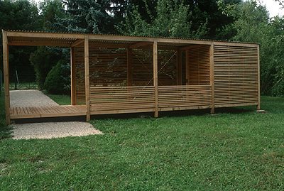 Der Architekt Georg Marterer baute für die Familie Kretschy so eine Badehütte in einem flexiblen Modulsystem: Quadratischer Raster in Grund und Aufriß ( 2,20mx2,20 m), jederzeit und in jede Richtung beliebig erweiterbar. Im jetzigen Zustand mißt sie etwa 22 m². Dass der Architekt hier „baute“ ist wörtlich zu verstehen, denn Georg Marterer setzte die Hütte eigenhändig zusammen. Die Pfosten-Riegel-Konstruktion aus Holz wird mit Tauen unprätentiös ausgefacht. Einfache Details zeigen konsequent und offen die Abtragung der Lasten und lassen keinen Zweifel an der Möglichkeit einer jederzeitigen Demontage. Das ungehobelte Holz wird im Laufe der Jahre eine silbergraue Patina ansetzten und das Gehäuse mit der Natur eins werden lassen. Die Wände aus horizontal paralell verlaufenden Latten bieten den notwendigen Schutz vor Wind und Regen, aber auch - und vor allem - vor unliebsamen Einblicken. Das Aluminium-Wellblechdach gibt den nötigen Schutz gegen den freien Himmel.