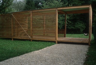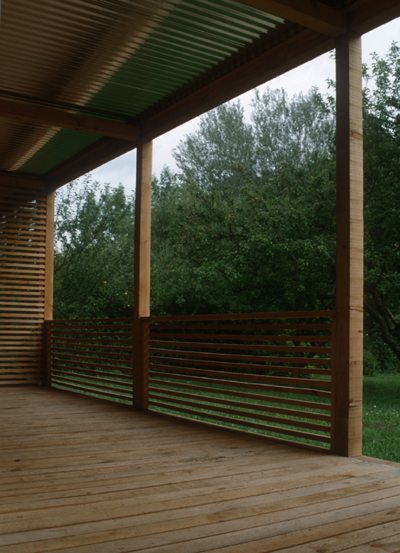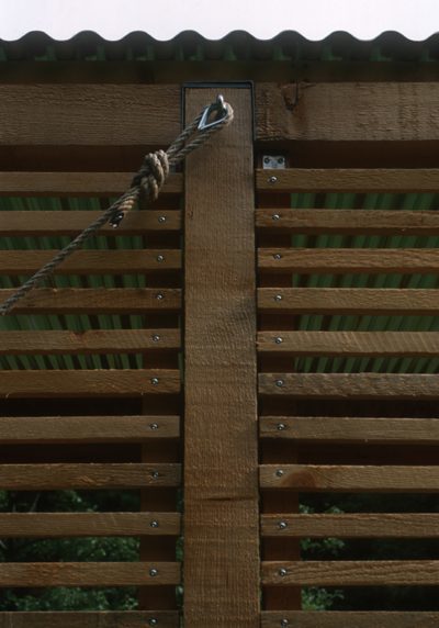 Die Badehütte steht quer zum langgestreckten Grundstück. Eigentlich steht sie nicht, vielmehr schwebt sie. Die Pfosten sind über Stahlstifte in ine kleine Fundamentplatte eingelassen, der Boden aus sägerauen Dielen ist abgesetzt vom Rasen und ermöglicht ausreichende Belüftung. Der quergestellte Riegel trennt das Grundstück in einen halböffentlichen „Vorgarten“ und einen abgeschiedenen, ganz privaten Bereich. Ein Kiesweg, in seinen Abmessungen dem Modulsystem angeglichen, führt unter der Badehütte hindurch. An seine Schnittstelle mit der Hütte ist das Gebäude völlig offen belassen und bildet auf diese Weise erst das Eingangsportal zum Garten. Wie ein Bild rahmt die Konstruktion das Grün im Hintergrund. Die beiden mittleren Module sind zum Erschließungsweg komplett, zum Garten hin brüstungshoch geschlossen. Hier befindet sich der eigentliche Aufenthaltsbereich, geschützt gegen die Öffentlichkeit jedoch offen für die Natur. Das vierte Modul ist komplett mit Latten geschlossen und innen zusätzlich verglast. Der würfelförmige Raum bietet Platz zum Unterstellen von Gerätschaften und Möbeln.