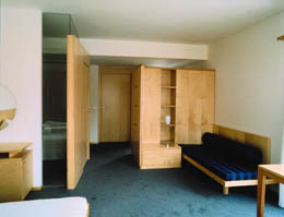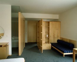 Die Zimmer sind mit einfachen Möbeln aus hellem Birkenholz ausgestattet, ein kecker Sessel mit einseitiger Armlehne aus dem Sortiment der Firma Wittmann rundet die Einrichtung ab. Ein kastenartiger Holzteil birgt die raumsparende Schiebetüre, durch die man ins Bad gelangt. Zwei schmale Glasstreifen in der räumlichen Hülle des Badezimmers lassen Tageslicht eindringen, sodaß der kleine Raum weniger eng wirkt. Die Aus- und Durchblicksmöglichkeiten werten ihn zusätzlich auf. Die Hotelhalle ist ebenfalls mit Fauteuils im Design von Paolo Piva bestückt. Man wagt gar nicht zu raten, woher die romantisierenden Möbel für das erste Projekt wohl gekommen wären.