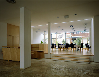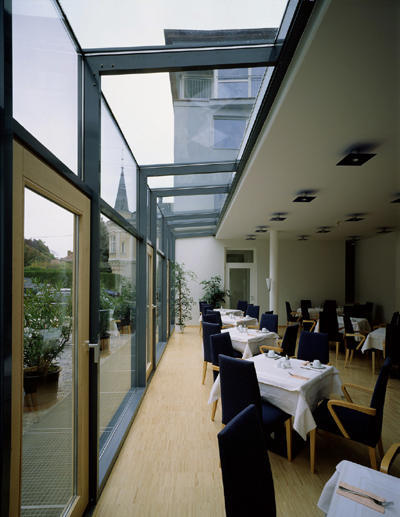 Das kürzlich fertiggestellte und in Betrieb genommene dreigeschoßige Bauwerk mit zurückgesetztem Dachgeschoß verfügt über einen großzügig geöffneten Eingangsbereich: Nach vorn öffnet sich die breitgelagerte Halle mit Rezeption und einer Bar zur Linken, imHintergrund schließt der um drei Stufen erhöhte Frühstücksbereich an, der von einem Oberlichtstreifen direkt hinter der Rezeption und von einer Glaswand zum Hof morgendliches Licht erhält. Ein großer Konferenzraum, der um einen mittelgroßen Seminarraum erweiterbar ist, und ein Sitzungszimmer füllen die Gebäudeecke hinter der markanten Natursteinverkleidung.