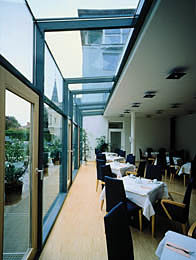 Die in Krems verbreiteten Erkerfenster aus der Biedermeierzeit mit gewölbten Glasscheiben waren den Architekten aufgefallen. Man konnte, als sich das Leben noch auf den Gassen abspielte, seine Neugier befriedigen, ohne den Fensterflügel öffnen zu müssen. Man darf annehmen, daß diese Erkerfenster Anfang des 19. Jahrhunderts in Mode gekommen waren. - Eine zeitgenössisch interpretierte Form der Beziehung zum Straßenraum sollte für die Hotelzimmer in vergleichbarer Weise versucht werden. Da der Winkel an der freistehenden Gebäudeecke etwas weniger als 90 Grad aufweist, sind die Zimmer, der Schräge der Fassade folgend, entsprechend zurückgestaffelt.