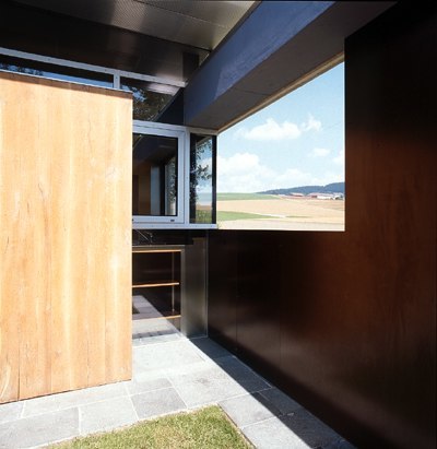 Dieser Topos auch etlicher anderer PAUHOFscher Entwürfe wurde nun zum ersten Mal realisiert. Kaum merkbar abgehoben, liegt ein schwerer, metallverkleideter Quader auf dem darunterliegenden Bauteil, nur mit einem Glasschlitz dazwischen. Außen führt dieser schmale Glasstreifen somit ein paradoxes Lasten vor, innen provoziert er eine besondere Räumlichkeit im Wohn- und Eßbereich. Die tatsächlichen konstruktiven Verhältnisse sind verborgen, denn jede Seitenwand setzt sich aus einem Stahlfachwerk zusammen, das an einem aufragenden vertikalen Betonelement hängt. Diese Verankerung wird nun durch die Wärmedämmung und die Metallverkleidung verdeckt. So soll hier nicht die „konstruktive Wahrheit“ vor Augen geführt werden, sondern der Effekt mi-nimalistischen Schwebens.