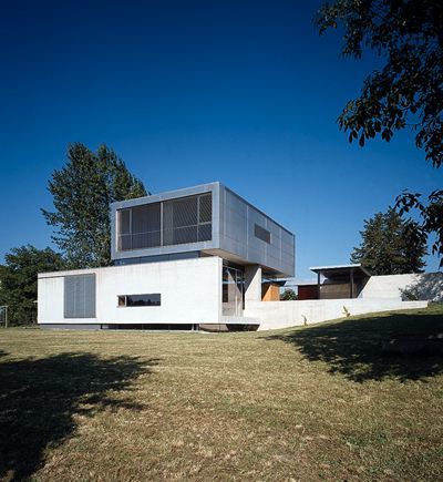 So wurde auch der Entwurf für das Landhaus P. beim zweiten Versuch eher zufällig genehmigt. Dabei zeigt es sich als Fremdkörper nur im Kontext der umliegenden Bebauung, nicht in bezug zur Landschaft. Mit einer weit ausgreifenden, einen Gartenhof begrenzenden Betonmauer folgt es den Schichtenlinien des Hanges, der auf der anderen Hausseite abfällt. Diese an Entwürfe von Mies van der Rohe erinnernde, über den Bau hinauslaufende Fläche fügt das Haus in die Landschaft ein. Über dem niederen Baukörper schwebt dann, quer dazu, ein zweiter, unabhängiger. In diesen beiden Bewegungen - einerseits mit dem Hang, andererseits quer zu diesem - interpretiert das Landhaus die Landschaft auf abstrakte Weise und ist darin dem Welzenbacherschen Bau wohl nicht zufällig ähnlich.