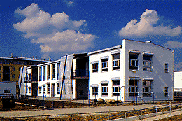 Man muß schon sehr viel näher treten und in der Anlage herumflanieren, um dahinterzukommen, daß es zumindest einen Ort gibt, der als Zentrum, als städtebauliche Mitte, definiert ist. An diesem Platz kreuzen sich zwei Fußwege, die das Areal erschließen – einer davon wird über einen Steg, der hier gebaut werden soll, die beiden durch die unverbaute „grüne“ Mitte des Marchfeldkanals getrennten Bauteile miteinander verbinden. Um diesen Platz sind aber auch jene Bauten organisiert, die gewisse öffentliche Funktionen erfüllen: Otto Häuselmayers Kirche, eine große Schule der Architekten Hübner und Leibetseder – und jetzt auch ein Kindergarten von Johann Georg Gsteu.