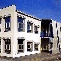 Das drückt sich auch nach außen sichtbar aus: Wo die Gruppenräume die geringste Raumtiefe haben, ist das kleinste Fenster. Man betritt das Haus an der Nordseite, vom Vorplatz her. Durch die Schrägstellung des Verwaltungstraktes ergeben sich Richtung Westen zwischen Verwaltung und eigentlichem Kindergartentrakt ein kleiner offener Hof und im Osten eine einladende Eingangshalle.