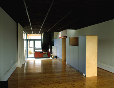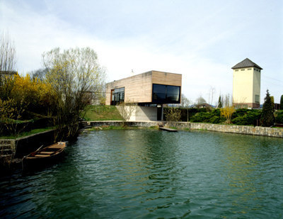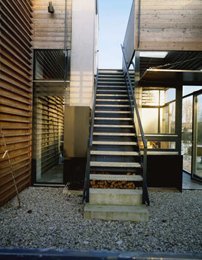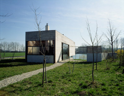 Die völlig verglaste Stirnseite des Einfamilienhauses ragt über das Wasser des Teiches. Das Innere des Hauses besteht aus einem Einraum, der sich zum Wasser hin durch eine Vollverglasung öffnet. Der Wohnbereich ist durch ein paar Stufen angehoben. Eine Treppe führt in den Schlafbereich, die Galerie. Die Erschließung erfolgt über einen klar definierten Hof mit Kieselsteinen, der in den Einraum des Erdgeschosses führt, der zur Hofseite großzügig verglast ist und durch Glasschiebeelemente öffenbar ist. Eine separate Treppe führt auf eine Dachterrasse, die von Einblicken geschützt ist.