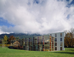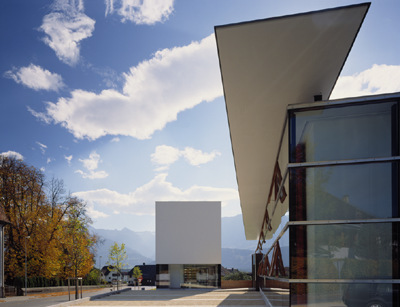 Auch die unterschiedlich ausgebildeten Fassaden des Turms reagieren auf die Situation: Entlang der Straße sind sie weitgehend geschlossen, zum Tal hingegen durch Fenstertüren großzügig geöffnet. Die beiden obersten Geschoße dienen als Hausmeister - Wohnung, darunter liegen die Ebenen der Bibliothek, deren verglaster Eingang am Platz sehr einladend wirkt.