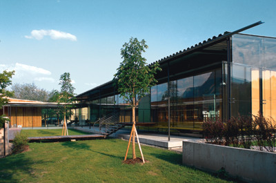 Die Höhendifferenz der Längsträger reflektiert die unterschiedlichen Stützweiten und ergibt zugleich die Dachneigung. Der High-Tech-Appeal entsteht aus einfachsten, gewieften Details zum Preis eines grösseren Einfamilienhauses. Die Innovationen umfassen sämtliche Aspekte der Ausstattung, der inneren Raumzusammenhänge, der Materialpalette, der Klima- und Akustikfragen. Sie entspringen einer ebenso profunden wie unkonventionellen Einsicht in die Aufgabe.