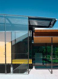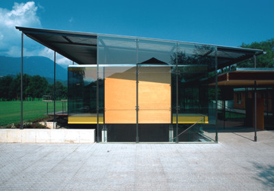 Oben durch den rundum vorspringenden, unterlüfteten Dachschirm, unten durch den ins Gelände gesenkten Jugendraum, der durch Abböschungen von Süden und Norden, aber auch seitlich über die offenen, verglasten Abgänge belichtet wird. Konstruktiv hängt die Box an den Längsträgern unter dem Blechdach mit Lastabtragung auf Betonsäulen im Untergeschoss.