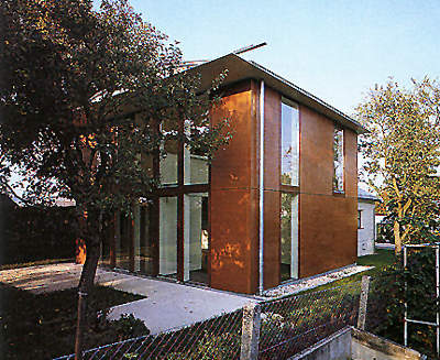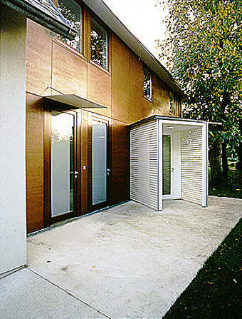 Da das Grundstück einen sehr dichten Baumbestand aufweist, entstand die Idee, den Grundriss des Hauses nach ihm auszurichten. Dadurch ergab sich sowohl das Zurückweichen der Eingangsfront als auch die Schrägstellung des durch die Sperrholzfassade gestreckten Eingangspavillons aus weißen Holzlamellen; schon von der Straße her sichtbar, fungiert er als Signal, dient aber gleichzeitig als leichter Sichtschutz zum Garten hin und bildet einen Kontrapunkt zur rotbraun lasierten Fassade.