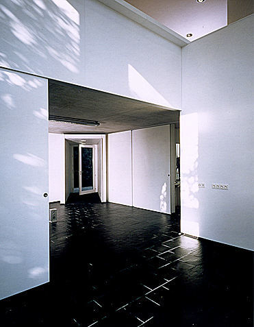 Die schon von außen erkennbare Transparenz, die durch große Glasflächen gewährleistet wird, setzt sich im Inneren der zweigeschoßigen Holzriegelwandkonstruktion fort. Dem Wunsch der Bauherrin nach einem möglichst offenen Raum entsprechend, verschränkte Mittermair das quer zum Garten hin orientierte, mit schwarzem Schieferboden versehene Erdgeschoss mit dem längsgerichteten, mit Holzboden ausgelegtem Obergeschoss durch eine Galerie, wodurch ein großes Raumvolumen mit differenzierten Blickpunkten und unterschiedlichen räumlichen Situationen und Zonen entstand.