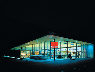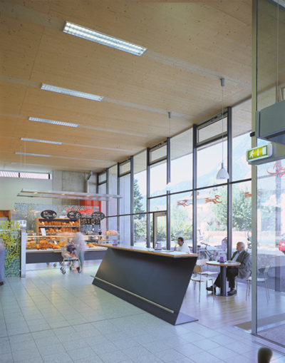 Die nach Süden geneigte, Lager- und Verkaufsfläche überspannende Dachplatte senkt sich parallel zum Parkplatz ab. Das östliche Oberlicht steigt im Verhältnis zur Auskragung direkt proportional, im gleichen Mass nimmt die Abschattung zu. Der Lager-Container aus Lärchenholz dient in diesem gegenläufigen Spiel der Licht-und Schatten-Linien gewissermassen als Waag-Latte. Der westliche Lichtschlitz mit seiner metertiefen Laibung versorgt die Untersicht der Hallendecke mit oszillierendem Reflexlicht. Im Süden kippt das Dach zu Boden, die dadurch eingehauste Anliefungsrampe schützt die Nachbarn vor lästigem Lärm.