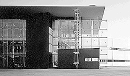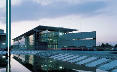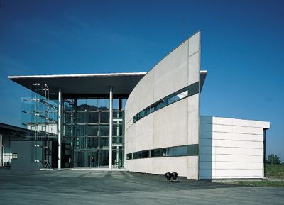 Giselbrecht erfüllt mit dem 110 Meter langen Bau in seiner technoiden Handschrift aktuelle Erwartungen in der Pflege der Unternehmensidentität; mit seinem weit auskragendem, bergenden Dach, mit den weißen, fein detaillierten Aluminiumfassaden und den großzügigen, intelligent beschatteten und öffenbaren Fensterflächen wird zeitgemäße Modernität angedeutet. Überzeugend ist, daß sich Giselbrecht nicht mit konventionellen Büroorganisationsmustern zufrieden gibt, er faßt das Haus vielmehr als durchorganisierten Apparat, eigentlich als einen einheitlichen „Arbeitsplatz“ auf, der einer neuartigen Strukturierung und bedarf.