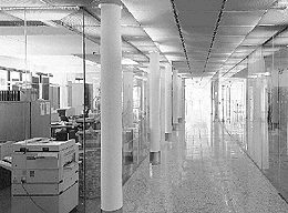 Die räumliche Konsequenz dieser Organisationsform liegt in der Auflösung der gewohnten Dreigliedrigkeit eines effizienten Bürogrundrisses. Der Mittelgang ist nicht mehr Restmenge des nutzbaren Raumes, sondern durch die Verglasung der meisten Innenwände Teil eines zusammenhängend wahrnehmbaren Ganzen. Wenn sich eine ambitiöse Unternehmenskultur, ein kooperativer Führungsstil, ein offener, reagibler Betrieb verräumlichen läßt, dann ist von Gieselbrecht eine entwicklungsfähige Option aufgezeigt worden.