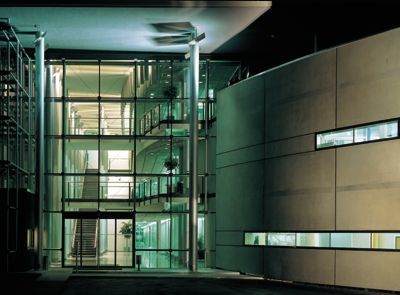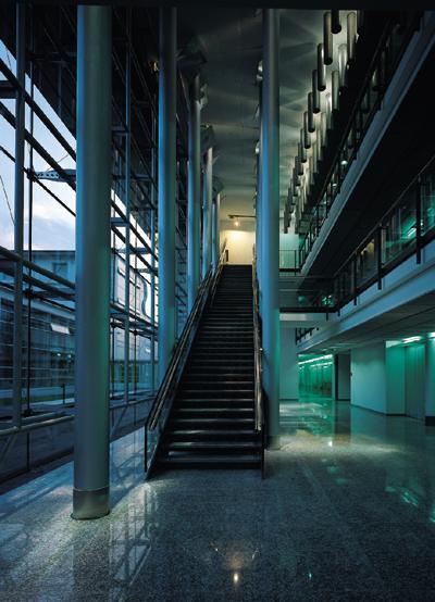 Daher werden über die an der Eingangsseite überzogenen Ansprüche hochbautechnischer Repräsentation hinaus differenzierte Ansätze einer neuen Bürolandschaft verwirklicht. Zum einen beeindruckt den Besucher die Hierarchielosigkeit des dreigeschoßigen Bauwerks. Hat man einmal die genau inszenierte Choreographie des Eingangs und des Stiegenhauses hinter sich gelassen, taucht man in eine ansprechend homogene Welt ein. Das Beanspruchen von möglichst vielen Fensterachsen als Beweis der eigenen Postion erübrigt sich hier ebenso wie der funktionsabhängige Drang „nach oben“.