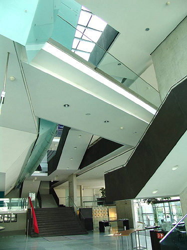 Dieser relativ ungewohnte Sachverhalt verstärkt das Gefühl, sich noch gar nicht in einem Innenraum zu befinden, sondern im Schutz des kragenden Glaskörpers vor allem von dessen räumlicher Abstrahlung zu profitieren. Wie zwei Ecktürme markieren die selbständigen Raumgebilde aus schlanken Stahlbetonscheiben die beiden Gebäudekanten zum ansteigenden Platz. Sie enthalten Fluchttreppen, Stiegen sowie einen Lift mit dazugehörigen Plattformen. Von diesen führen Stege zu den zwei versetzt übereinanderliegenden, tunnelartigen Galerien im Rücken des großen Saales.