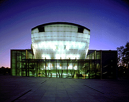 Die kompakte, flach-quadrische Großform des aus verschiedenen Teilen agglomerierten Gebäudes wird von zwei Elementen durchbrochen, die den Hauptzweck des Bauwerks entscheidend bestimmen: dem großen und dem kleinen Saal. Während die blaue Hülle des kleinen Saales nach außen Objekthaftigkeit signalisiert, spiegelt der große Körper tagsüber die wechselnden Lichtverhältnisse, um bei einbrechender Dunkelheit selbst zu leuchten. Beide sind sie in einen scheinbaren Schwebezustand versetzt, ein Effekt, der einerseits von der Materialisierung in Glas, andererseits von den überschlanken Stützelementen herrührt, die eher wie Zugelemente wirken, die ein Abheben verhindern sollen, denn als tragende Rundstützen.
