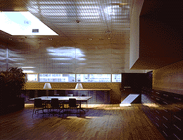 Die leicht gewölbte vielflächige Glashaut des Auditoriums stellt für hiesige Verhältnisse insofern ein herstellungstechnisches Novum dar, als der Zuschnitt der einzelnen, teils viereckigen, teils dreieckigen flachen Glaselemente vollkommen computergesteuert ablief. Die exakte Zeichnung in elektronischer Form ging an das Werk, wo der maschinelle Zuschnitt direkt ab Diskette erfolgte.