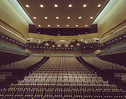 Das verheißungsvolle Äußere, das mit Einblicken nicht geizt, birgt im Inneren eine klare, dreidimensionale Struktur, die weniger durch ihre relative Symmetrie als durch weiträumige Übersichtlichkeit leicht verstehbar und begehbar wird. Den Kern bildet der breite, fast bullig wirkende große Saal, der auf den Bühnenkomplex mit Hinter- und Seitenbühnen ausgerichtet ist, über dem der Bühnenturm aufragt. Nach Westen und Nordwesten ist fast beschützend eine Schicht Büroräume winkelförmig davorgestellt. Sie erzeugt zur vorbeiführenden Zufahrtsstraße einen ruhigen, neutral wirkenden Abschluß. Nach Norden, der Ankunftsseite von der Stadt, liegen Foyers und Wandelgänge sowie der schon erwähnte kleine Saal, der sich hinter der blaugeschuppten Glashaut verbirgt. Im Osten verläuft die Eingangshalle unter Treppenläufen und Stegen und unter dem vom Boden her auf verhältnismäßig schlanken Streben hochgespreizten Heck des großen Saales durch das ganze Gebäude. Analog zu dem Platz davor steigt hier der Fußboden merklich an. Der öffentliche Raum wird auf diese Weise weit ins Foyer hineingezogen.
