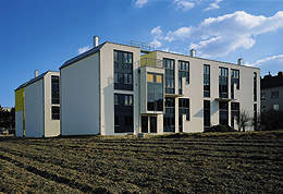 Der 1. Bauabschnitt umfasst einen Wohnblock mit 17 Lofteinheiten, die um einen großen Hof gruppiert sind. Die einzelnen Häuser - weiße Kuben - bestehen aus zwei übereinander gestapelten Lofteinheiten. Jedes der Häuser hat eine andere Fassade, schmale Durchgänge, verwinkelte Zwischenräume, Vor- und Rücksprünge machen die individuelle Note dieser Siedlung aus.