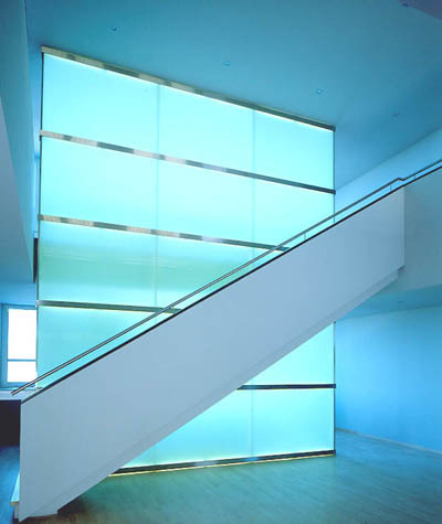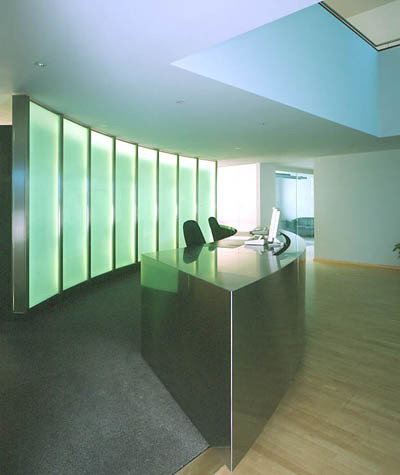 Das Foyer mit dem Empfangspult, der neuen Treppe und dem horizontalen und vertikalen Lichtglaselement dient dabei als Drehscheibe.