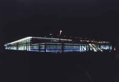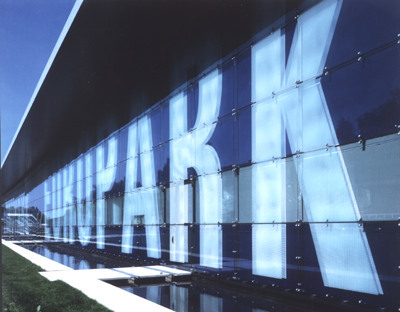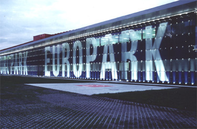 Das Haus ist riesig. Es ist 320 Meter lang und 140 Meter breit und wurde in zwei Etappen errichtet. Auf dem Gelände stand ein „alter“ Spar, der erst weggerissen wurde, nachdem die erste Bauphase abgeschlossen war. Fuksas hatte eine geniale Ausgangsidee: Er hat dem Gebäude eine zweischalige Glasfassade angemessen, die vom Schriftzug des Gebäudenamens - Europark - lebt. In großen Lettern zieht sich dieser Name um das Haus herum, in leicht verschobenen Rasterpunkten auf beide Fassadenschalen aufgebracht, sodaß sich eine plastische, fast holographische Wirkung einstellt.