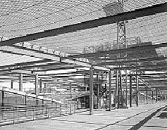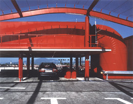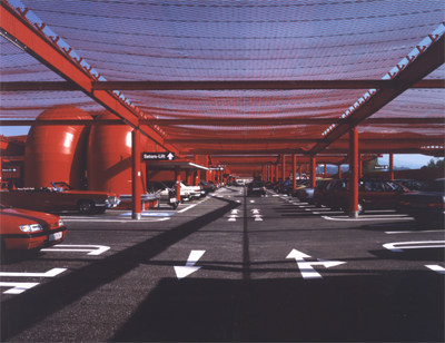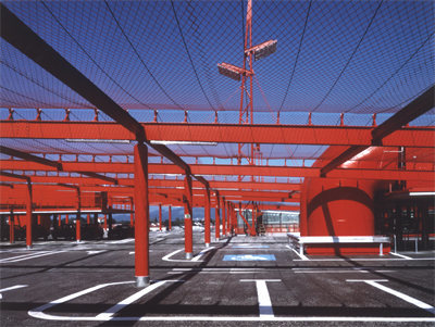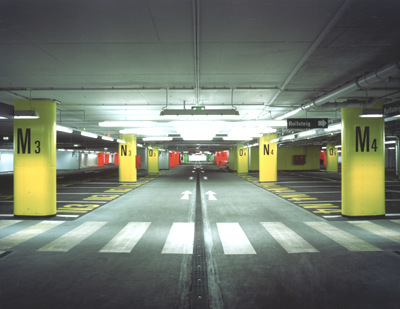 Der Architekt wußte auch diese Anforderung zu einer räumlichen Qualität umzumünzen: Die Tiefgarage ist farblich und typographisch so gelöst, daß man sich auf Grund des ornamentalen Einsatzes der Platzbeschriftungen hervorragend orientieren kann. Und die Auffahrt zum Parkdeck auf dem Dach schiebt sich als Spirale plastisch aus dem Gebäude heraus - eine Art Guggenheim-Museum ohne Außenhaut - und führt auf eine Dachlandschaft, die von einer leuchtend roten Streckmetallgitter-Welle überspannt ist und einen Ausblick bietet, der, ohne Übertreibung, einfach phantastisch ist.