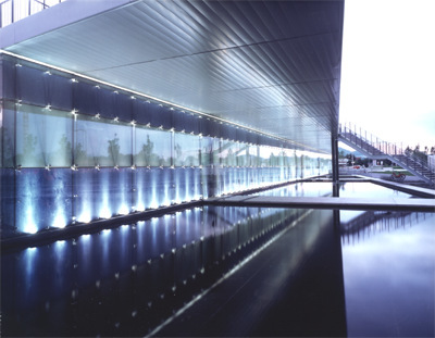 Auch die seichten schwarzen Wasserbecken, die sich um das Gebäude ziehen, sind irgendwo - nutzlos. Aber der optische Effekt, der vor allem bei Dunkelheit entsteht, wenn sich das Gebäude im Wasser spiegelt, ist großartig. Man meint, vor einem Abgrund zu stehen, dabei sind die Becken vielleicht zehn Zentimeter tief.