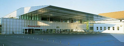 Der große Einkaufsmarkt am Lustenauer Dorfplatz wirkt auf den ersten Blick recht massiv in seiner demonstrativen Körperlichkeit, die von der mehrseitigen glatten Verkleidung aus Polycarbonat-Platten herrührt. Über dem lagerhaften Baukörper der Verkaufs- und Gastronomieräume und dem darauf befindlichen Parkdeck ist der voluminöse Dachkörper aufgestelzt, dessen Funktion als Witterungsschirm für die Fahrzeuge mit einer 20 Meter weiten Auskragung über den Platz zeichenhaft überhöht wird.