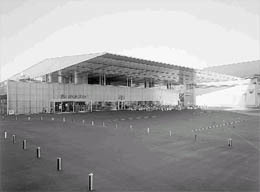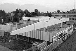 Was aus der Distanz betrachtet als Außenfläche eines Volumens erscheint, erweist sich aus der Nähe besehen als Membran, die, über einer Unterkonstruktion montiert, nachts durch zahlreiche Fluoreszenzlampen zum Leuchten gebracht wird. Damit wird die körperhafte Schwere aufgehoben. Die Hülle ist – ganz im Gegenteil – leicht. Unsere Erfahrung lehrt uns allerdings, dass jede Hülle, die nicht selbsttragend oder pneumatisch ist, ein tragendes Gerüst bedingt. Dieses Gerüst, das heißt die primäre und sekundäre Konstruktion, besteht weitgehend aus Holzwerkstoffen. Gezeigt wird uns dies an den Stützen, die zwar gehobelt, aber sonst als kräftige Brettschichtholzpakete, mithin als »Holz«, in Erscheinung treten. Von der horizontalen Tragstruktur sieht man vorerst nichts. Doch bleiben wir bei den Stützen, wie sie im Erdgeschoß zu sehen sind. Ihr Abstand ist recht groß, der Raster beträgt 8 mal 20 Meter. Jede Stütze erhält damit nahezu den Status eines Einzelobjekts. Ihre Dimensionen von 32 mal 40 Zentimeter und sogar 32 mal 90 Zentimeter an der Platzfront, wo die Last des kragenden Daches dazu kommt, entsprechen jenen von Stahlbetonstützen – sind aber aus Holz.