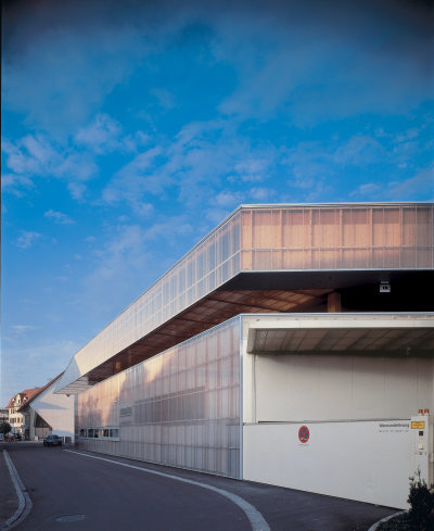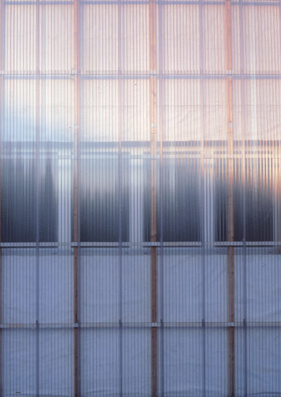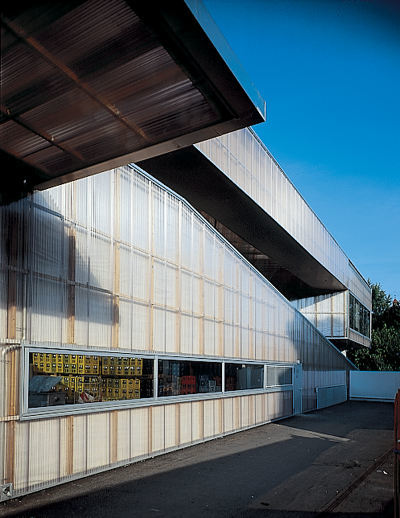 Auch hier überrascht wieder die rohe Oberfläche des Materials, die einen Eindruck jener gewaltigen Kräfte vermittelt, die von der Ingenieurholzkonstruktion verlässlich übernommen werden. Damit wird punktuell das Thema Schwere angesprochen, das sonst von der Oberflächenverkleidung stark gedämpft wird und selbst im Einkaufsmarkt, dessen Wände und Decken aus Mehrschichtplatten bestehen, kaum wahrgenommen wird. Da jedoch die Fakten, wie die Dimensionen der Stützen, das Parkdeck im Obergeschoß und die Spannweiten für große Lasten und somit für Schwere sprechen, genügen von dieser Seite punktuelle Hinweise, um die polare Spannung zu Leichtigkeit und Transluzenz der Verkleidung aus Polycarbonat-Platten aufzubauen. Und das macht die Architektur aus.