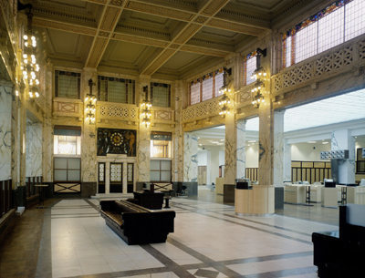In der Mitte liegt die zentrale Halle mit den beiden seitlichen Kassensälen als basilikale Raumkonfiguration. In die geklärte Baustruktur setzte Czech dann einzelne für ihn typische Elemente. Ergänzend zum bestehenden Eingang in der Längsachse öffnete man das Geschoß in der Querachse zum Fußgängerstrom. Hinter dem Eingang, dessen Vordach beiläufig die Metapher eines Fledermausflügels birgt, liegt eine kleine, dennoch komplizierte Treppenanlage - und verwinkelte oder schräge Treppen bilden einen kontinuierlichen Topos im Oeuvre von Czech.