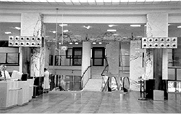 Am auffälligsten sind hier jedoch die Luftausbläser aus Nirosta. Im äußeren Bereich der Kassensäle stehen sie jeweils vor den Pfeilern und wiederholen damit die Raumstruktur. Mit dem kubischen Sockel und dem leicht nach vorne geneigten Säulenschaft interpretieren sie klassische Architekturelemente. Die Querteile mit den Weitwurfdüsen wirken fremd, doch sie können als Teile eines Architravs gelesen werden - mit den Düsen in der Art eines fragmentierten Frieses.