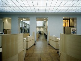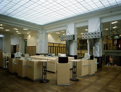 Im Sinne eines freien Blicks, der das Erfassen von größeren Zusammenhängen ermöglicht, verstand Czech auch die Renovierung und räumliche Reorganisation des Bank-Austria-Kundenzentrums in der Wiener Innenstadt. Das Kundenzentrum liegt in einem gediegenen, traditionalistischen Bau, der 1914 von Ernst von Gotthilf und Alexander Neumann fertiggestellt worden war. Czech entfernte alle Einbauten, sodaß sich das Hauptgeschoß jetzt als ein überblickbares Raumkontinu- um präsentiert, das verschiedene Pfeilerstellungen gliedern.