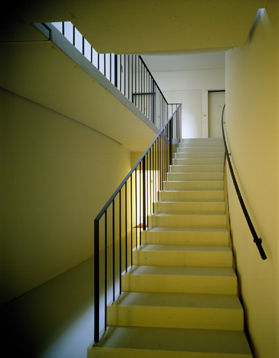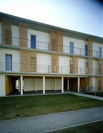 Die Wohnungen im Erdgeschoss besitzen Vorgärten, Dachterrassen auf den viErdgeschossigen Häusern mit Blick über die Traisen komplettieren ein bei äußerster Ökonomie doch subtil, elegant und brauchbar gestaltetes Angebot. (Text: Otto Kapfinger )