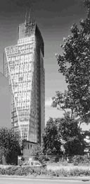 zurückhaltend. Dennoch ist auch dieser Bau eine durchkomponierte Skulptur. Man kann den Turm wie frühere Coop-Projekte als ein Ensemble von schrägen, raumbildenden Elementen interpretieren: An den Baukörperkanten sind die Glashüllen deutlich als selbständige Ebenen abzulesen. Zugleich ist aber das Körperhafte herausgearbeitet: Der Lüftungsturm ist der Kopf einer riesigen,archaisch anmutenden Figur. Die Unbestimmtheit zwischen diesen Lesarten trägt wesentlich zur besonderen Ausstrahlung des Gebäudes bei.