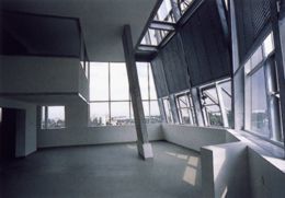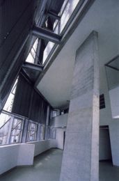 zwei aus dem neunten Stock abgespannten Stahlkabeln gehalten wird. Der Eingang liegt achsial und führt in ein zweigeschoßiges Foyer, vorbei an einer Portierloge, zu den Aufzügen. Der Grundriß überzeugt auf den ersten Blick – eine rationale Dreiteilung: ein Erschließungskern an der Nordseite und ein daran anschließender dreieckförmiger Zwickel, der sich entsprechend der Abschrägung des Baukörpers immer mehr verkleinert.