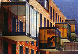 Man muss hinzufügen, dass es auch sehr daneben gehen hätte können, in dieser maßstäblich sicher nicht städtischen Umgebung Geschoßwohnungsbau zu realisieren. Da war die Gliederung in zwei Baukörper schon eine wichtige und richtige Entscheidung, und die Fassadenlösung ist es offensichtlich auch. Sie verharmlost die Häuser aber nicht, sie liefert einfach eine wirklich schöne und für diesen Ort passende Oberfläche. (Text: Liesbeth Waechter-Böhm, 07.05.2001)