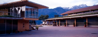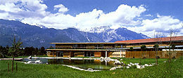 Der Bau ist großzügig verglast und mit Holz verkleidet und hat trotz seiner Grösse einen leichten Charakter. Das Flachdach ruht im Obergeschoss nur auf den Stahlfensterrahmen auf.