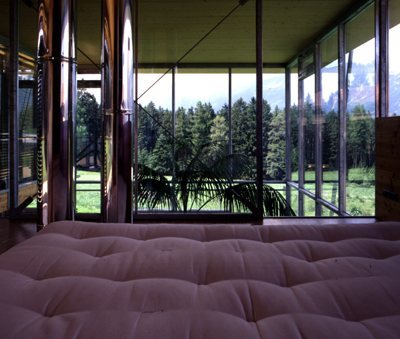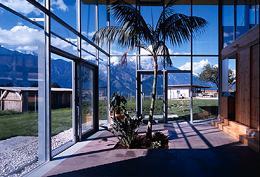 Eine 650 m² grosse begrünte Terrasse, ein Wintergarten mit einer in den Boden eingepflanzten Palme sowie die Begrünung des Flachdaches des eingeschobenen kleinen Hauses und die des langgezogenen Daches des Wirtschaftsgebäudes erweisen ihre Referenz an die Naturlandschaft, in der diese Anlage eingebettet ist.