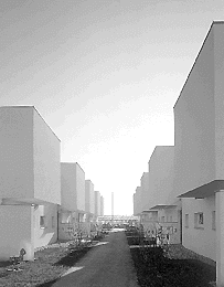 Aber nein, Geschoßwohnungsbau türmt sich hier auf, hier wird „städtische Straße“ gespielt, die doch nur Abstellfläche für Autos zwischen hermetischen Wohnhäusern ist. Und diese falsche Rhetorik, die manche der Wohnhäuser an den Tag legen! Sie trumpfen mit einer Wuchtigkeit auf, die hier, am äußersten Rand der Stadt, wahrhaftig nichts verloren hat - unangemessen, maßstabsprengend. Die Frage ist wirklich angebracht, warum jemand so weit hinausziehen soll, wenn er dann eine solche Umgebung vorfindet, wenn er dann so systematisch um die Vorteile dieser Grünlage gebracht wird.